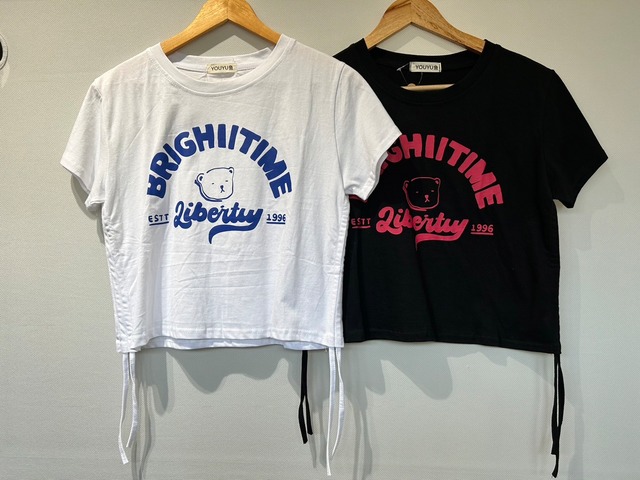 レディース/トップス/半袖/プリントTシャツ/サイドアップ/サイドリボン紐/デザインTシャツ/クルーネック/韓国ファッション