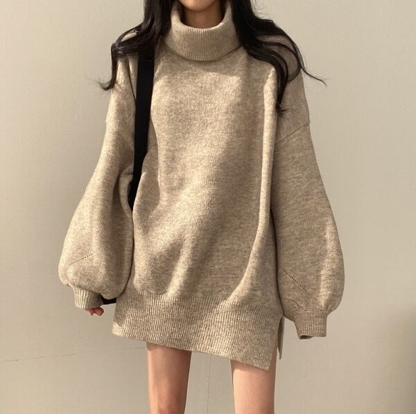 レディース/タートルネック/ニット/オーバーサイズ/ハイネック/サイドスリッド/パフスリーブ/ゆったり/韓国