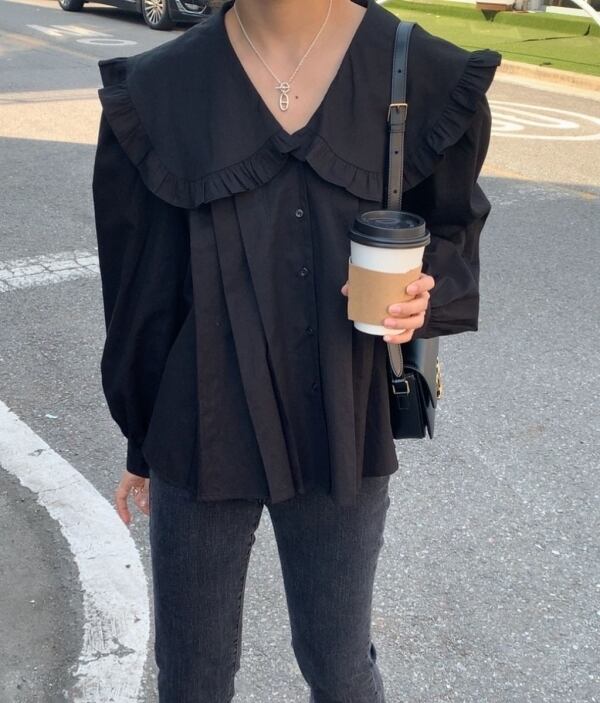 フリル襟付/長袖/ブラウス/カラーシャツ/ボタンフロント/韓国/レディース