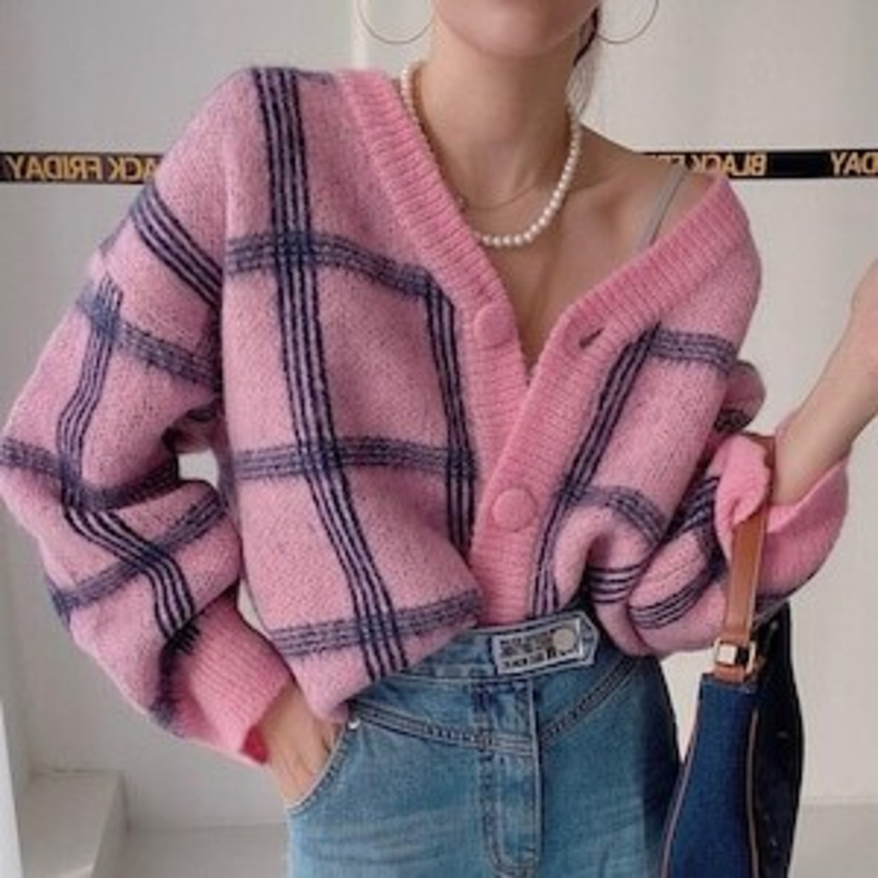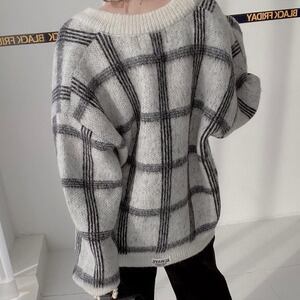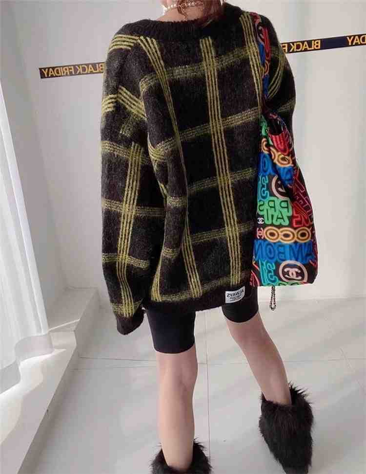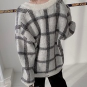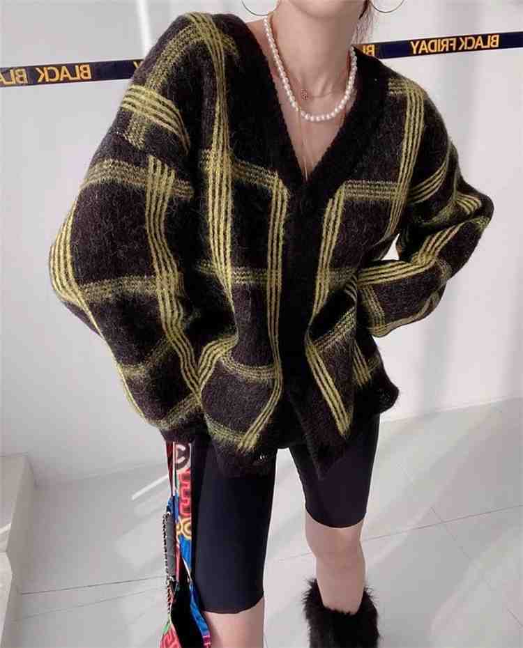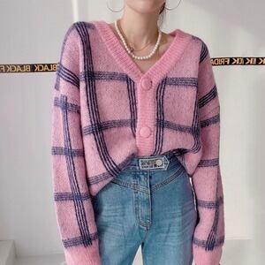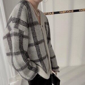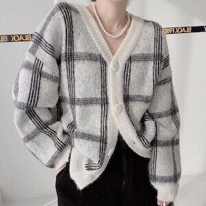 カーディガン/レトロ/チェック柄/韓国/ニット/Vネック/カジュアル/前開き