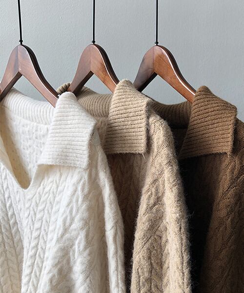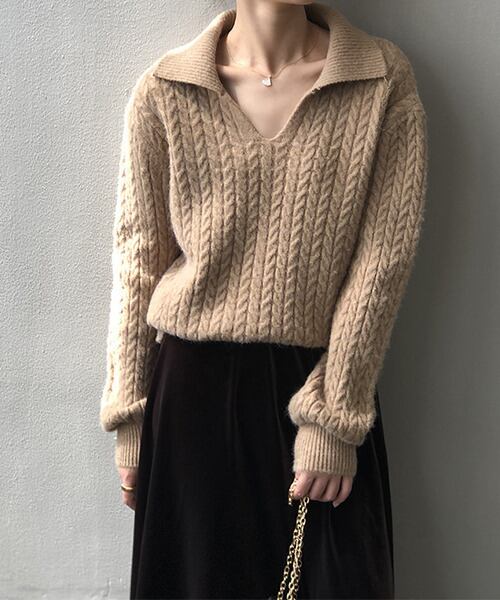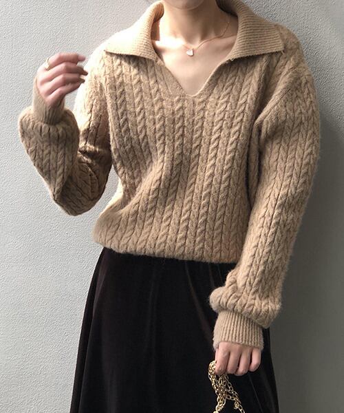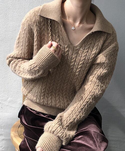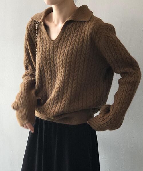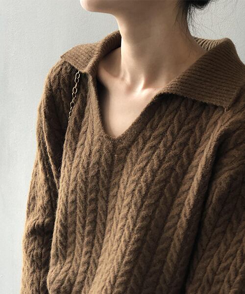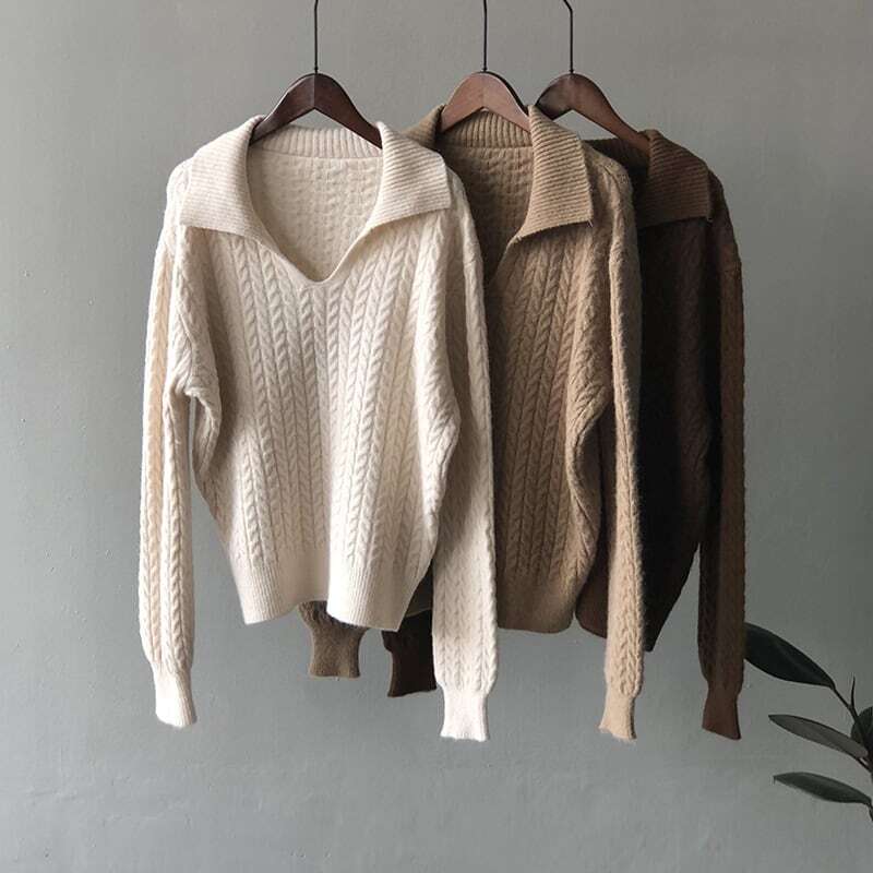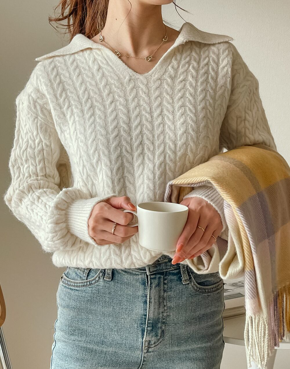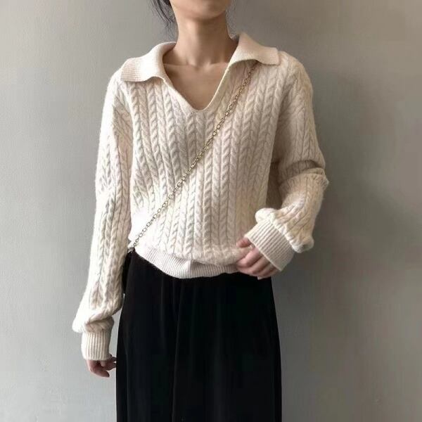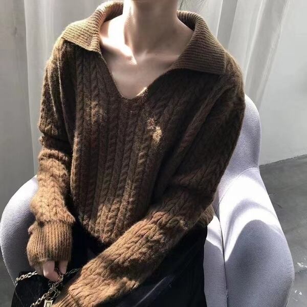 トップス/襟/オープンポロ/ニット/ケーブル/セーター/レトロ/Vネック/ルーズ/レディース/秋冬
