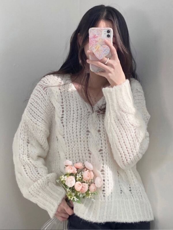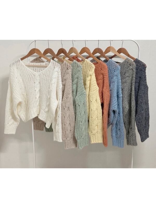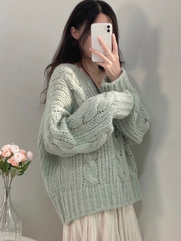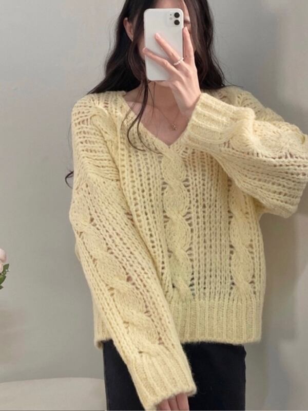 レディース/トップス/ニット/ケーブル編み/Vネックニット/ざっくり/カラー/着回し/重ね着/ローゲージ/ゆったり/韓国/秋冬春