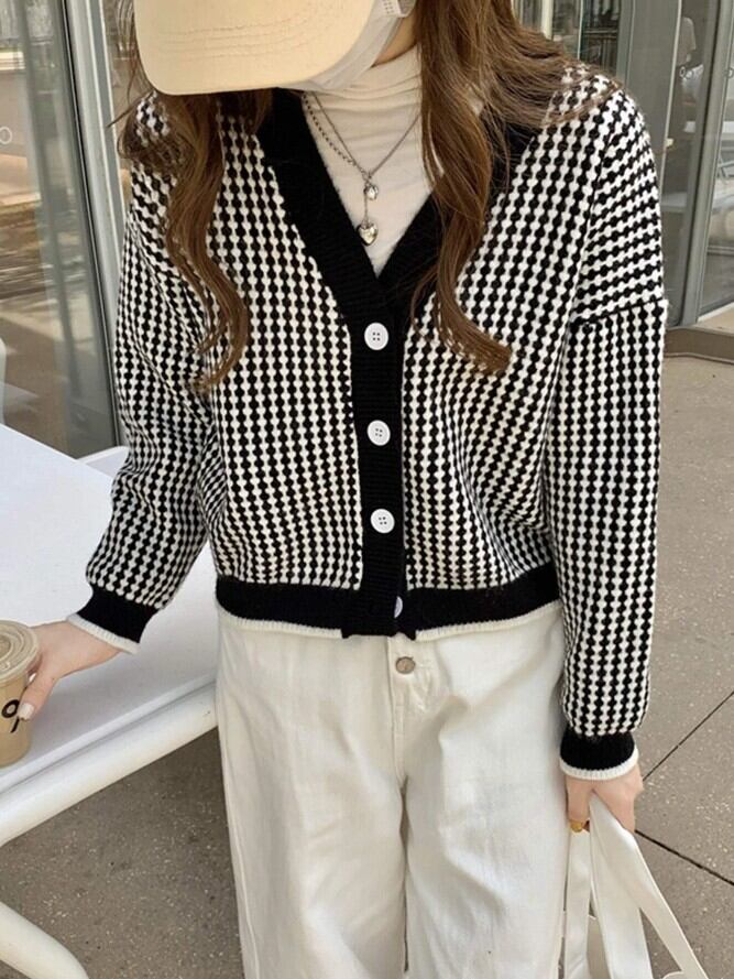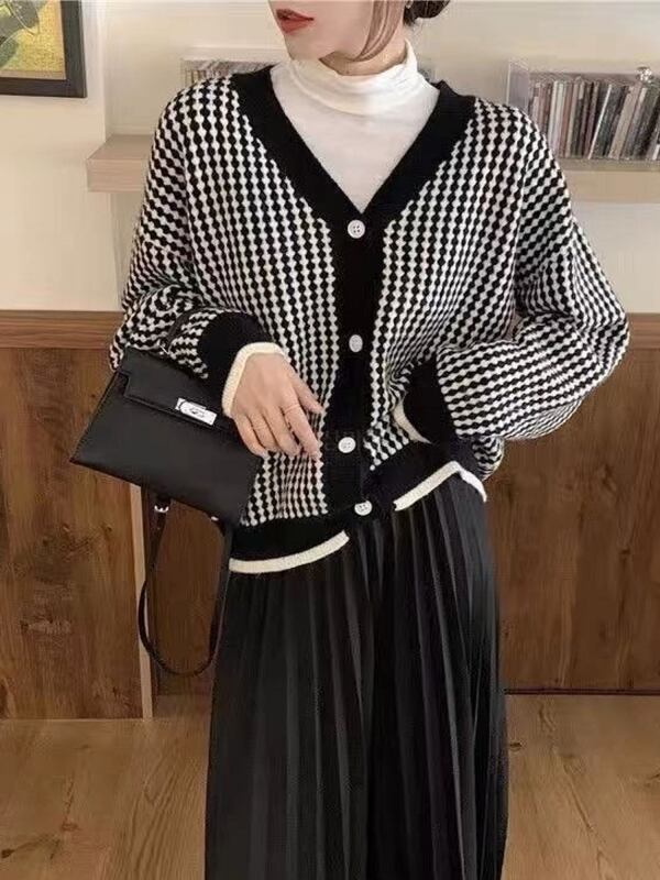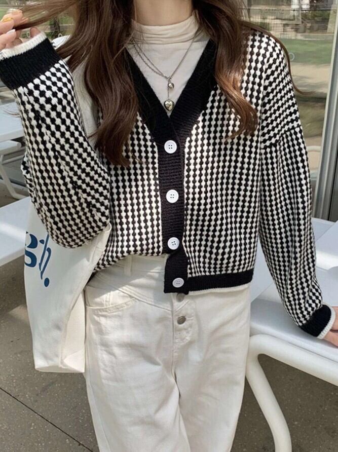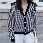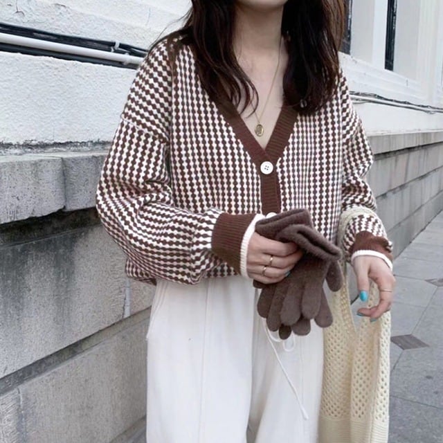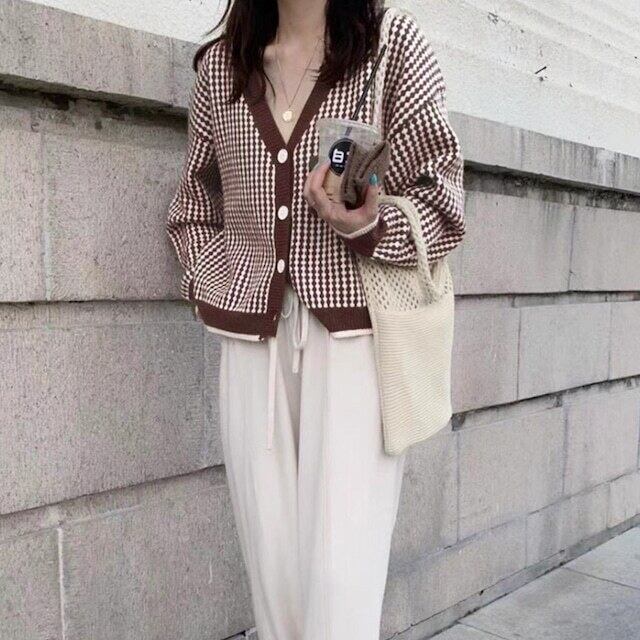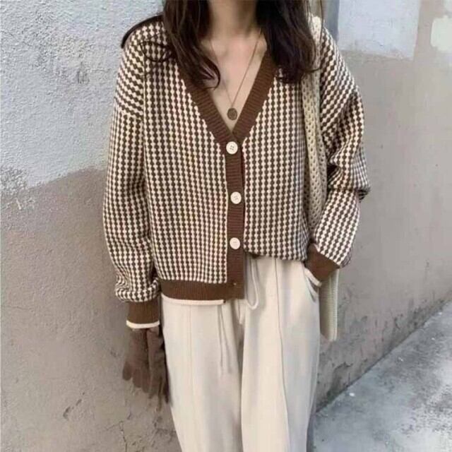 カーディガン/ニット/レトロ/ガーリー/Vネック/秋冬春/レディース/ジャガード/韓国/セーター