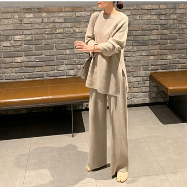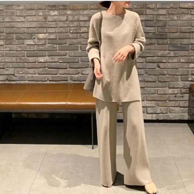 セットアップ/ニット/トップス/パンツ/フォーマルウェア/リブニット/春秋冬/ガウチョパンツ/ワイドパンツ/2点セット/クルーネック/韓国/春秋冬/ゆったり/レディース