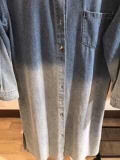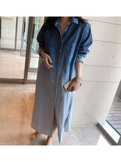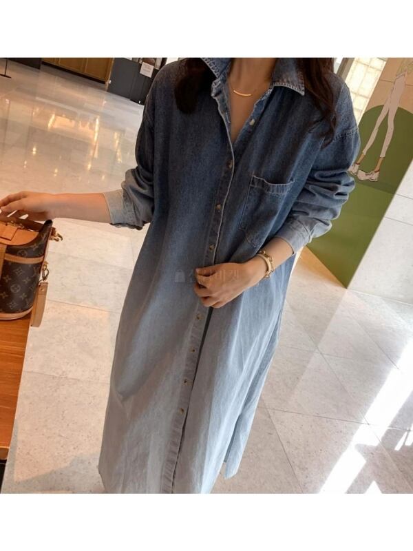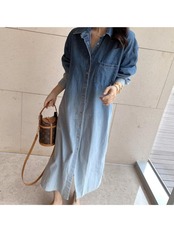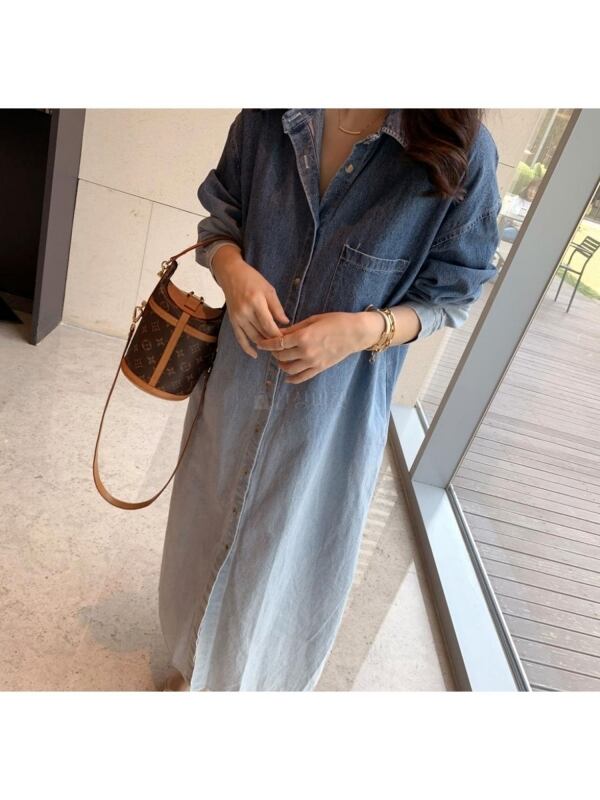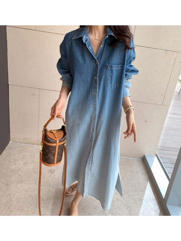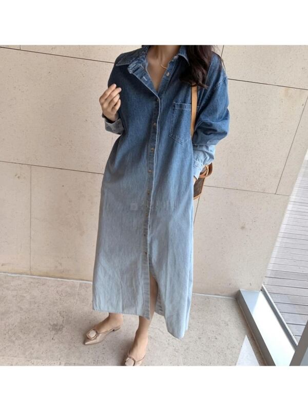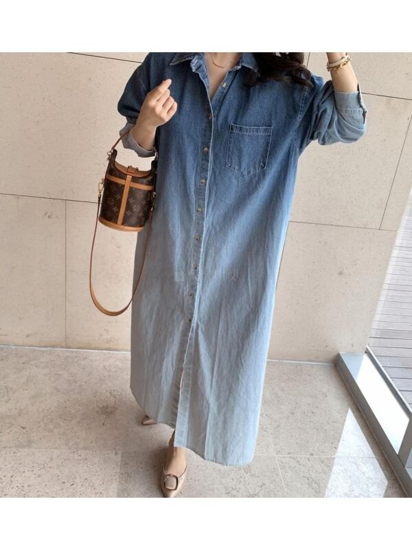 デニムワンピース/大人カジュアル/デニム/カジュアル/ワンピース/サイドスリット/デニムシャツ/グラデーション/長袖/韓国/春夏/秋冬