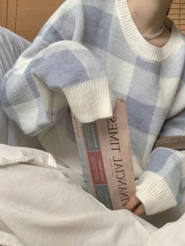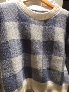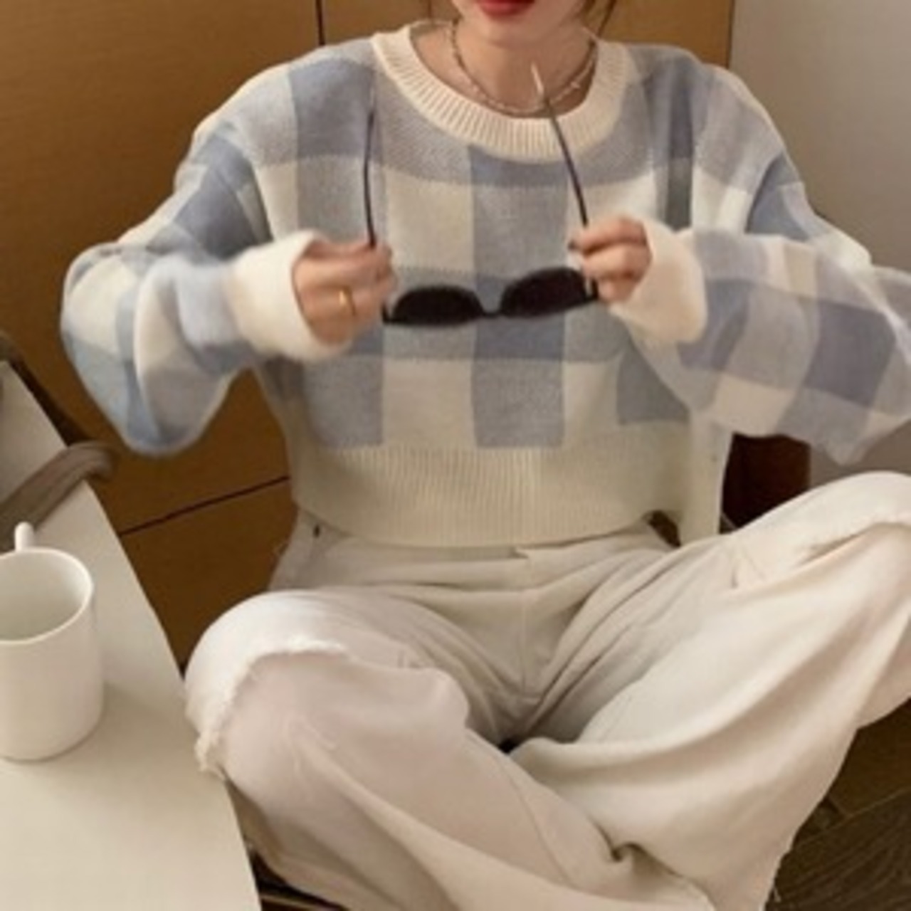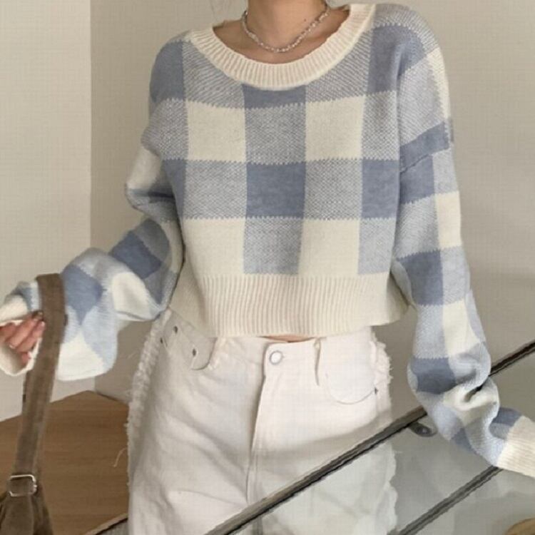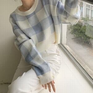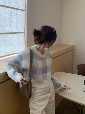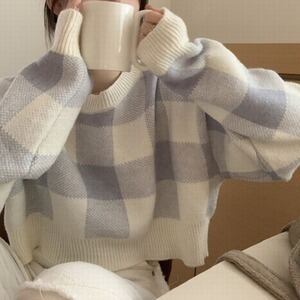 トップス/長袖/2カラーギンガムチェック/ボックスチェック/ニット/ショートニット/セーター/春秋冬/可愛い/韓国/レディース