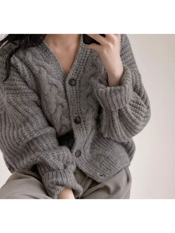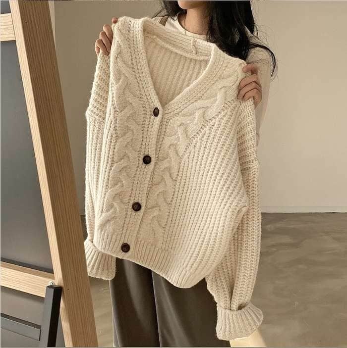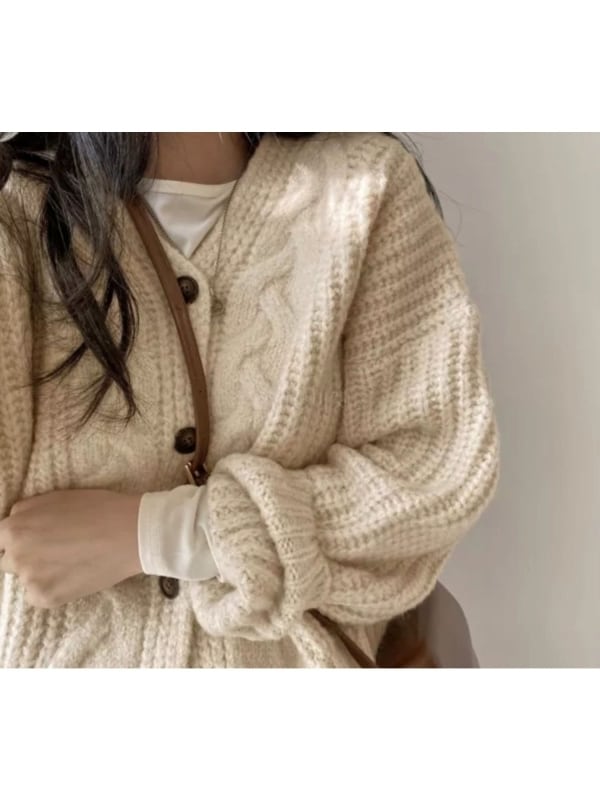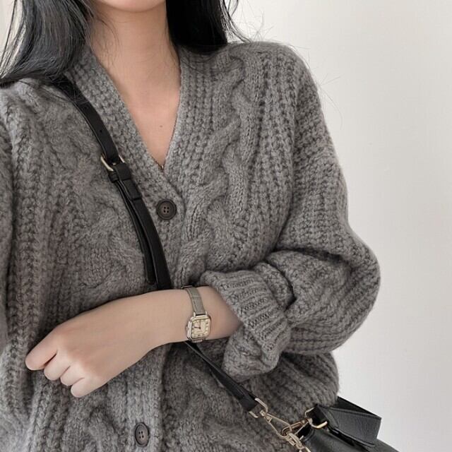 トップス/カーディガン/ニット/ケーブル編み/Vネック/3色/ローゲージニット/オーバーフィット/韓国/レディース/秋冬