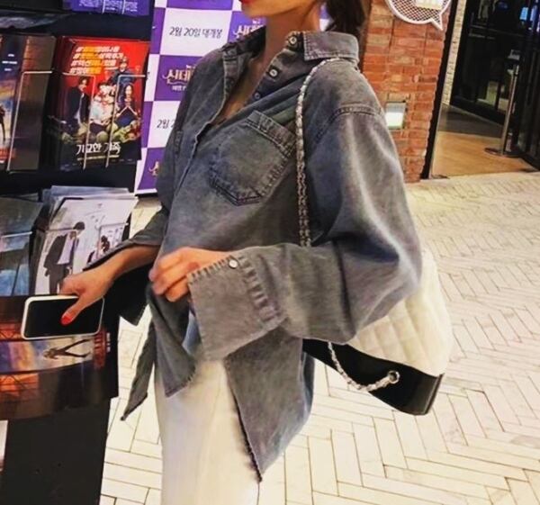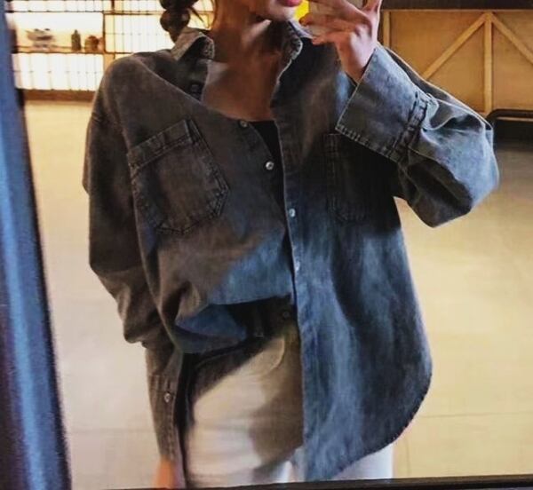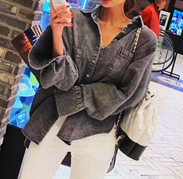トップス/長袖/デニムシャツ/サイドスリッド/襟付き/春秋冬/レディース/韓国