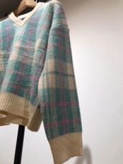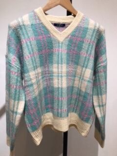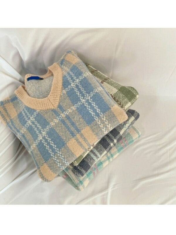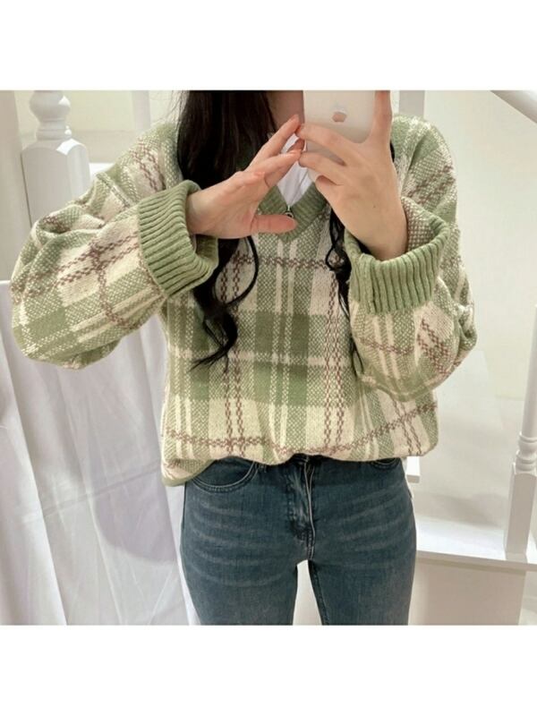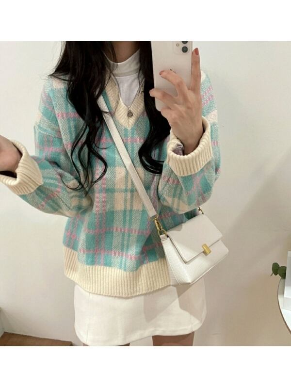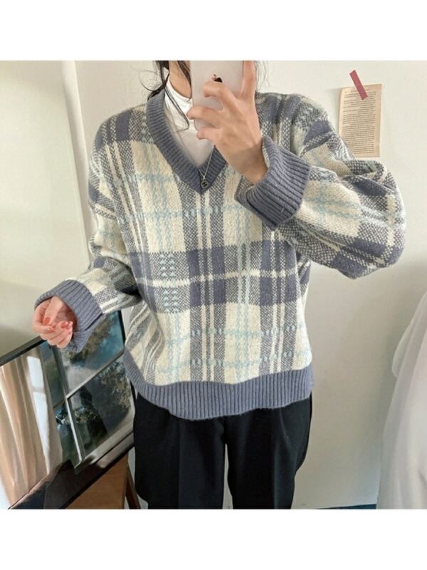 ニットトップス/セーター/チェック柄/Vネック/ゆったり/プルオーバー/レディース/韓国