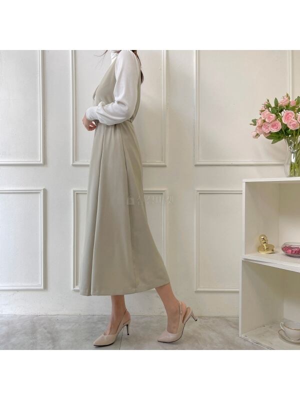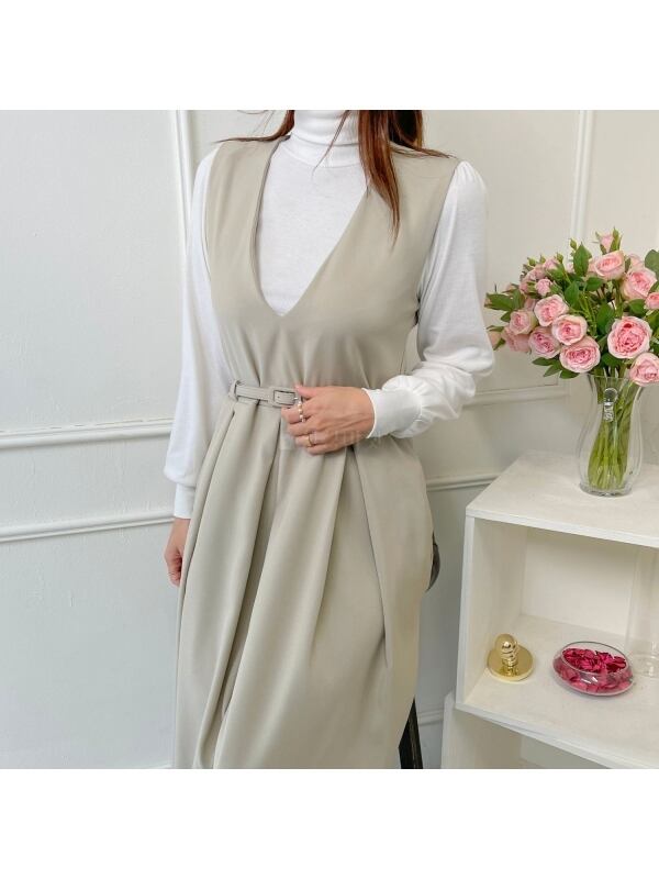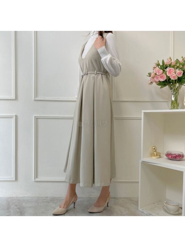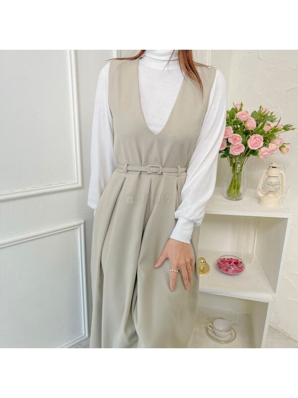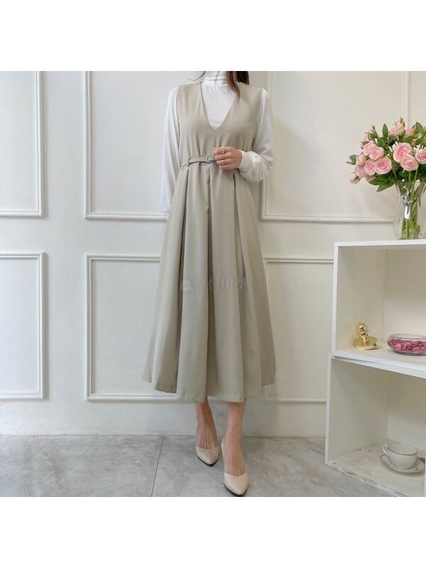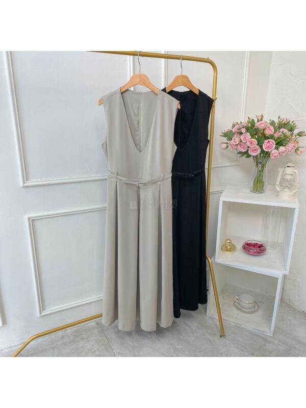 レディース/ワンピース/ロングワンピース/スカート/Vネック/ノースリーブ/ベルト付き/無地/韓国/春服