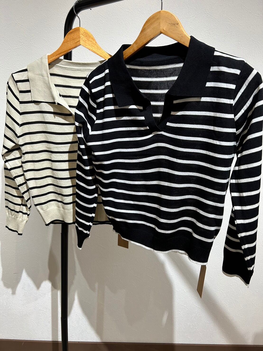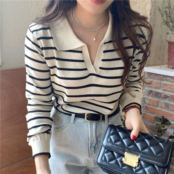 レディース/トップス/長袖/ポロシャツ風/ポロニット/サマーニット/襟付き/Vネック/ボーダー柄/春服/韓国