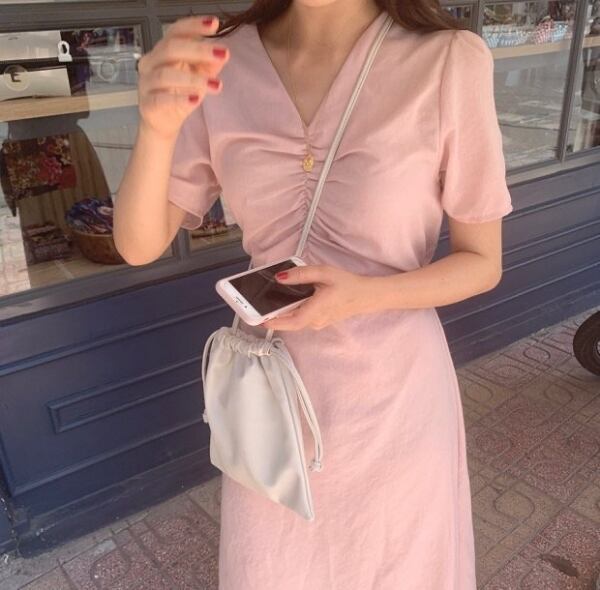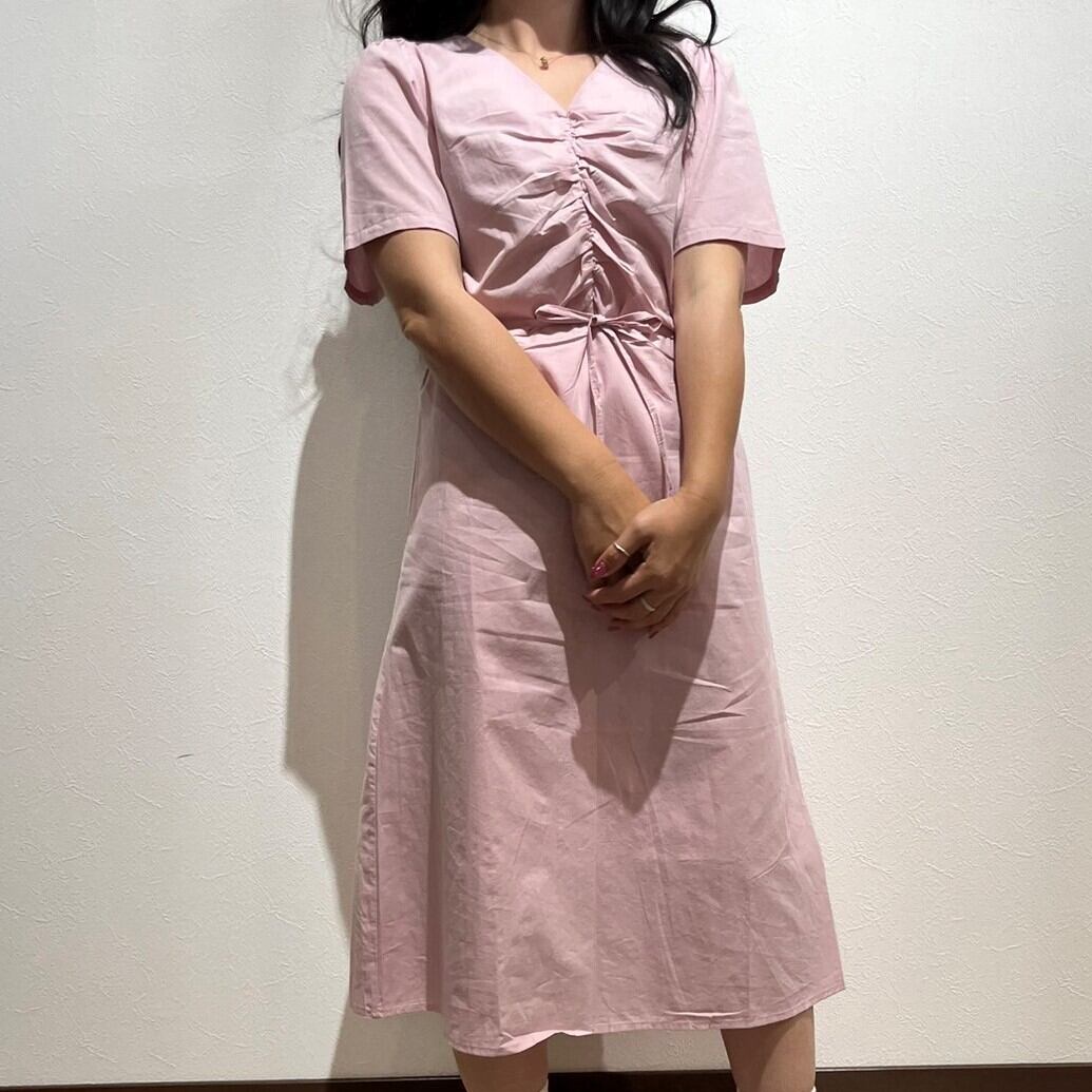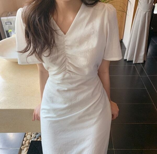 レディース/ワンピース/ひざ丈/パフスリーブ/胸元ギャザー/Vネック/カジュアルワンピ/半袖ワンピ/韓国