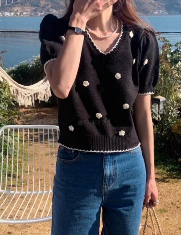 レディース/トップス/サマーニット/バイカラーニット/Vネック/ガーリー/カジュアルガーリー/韓国