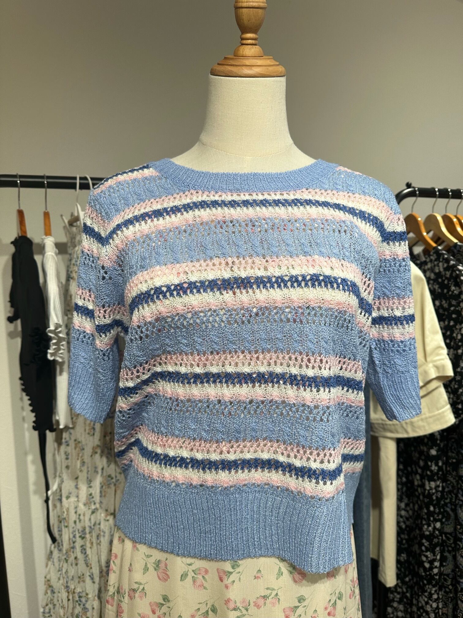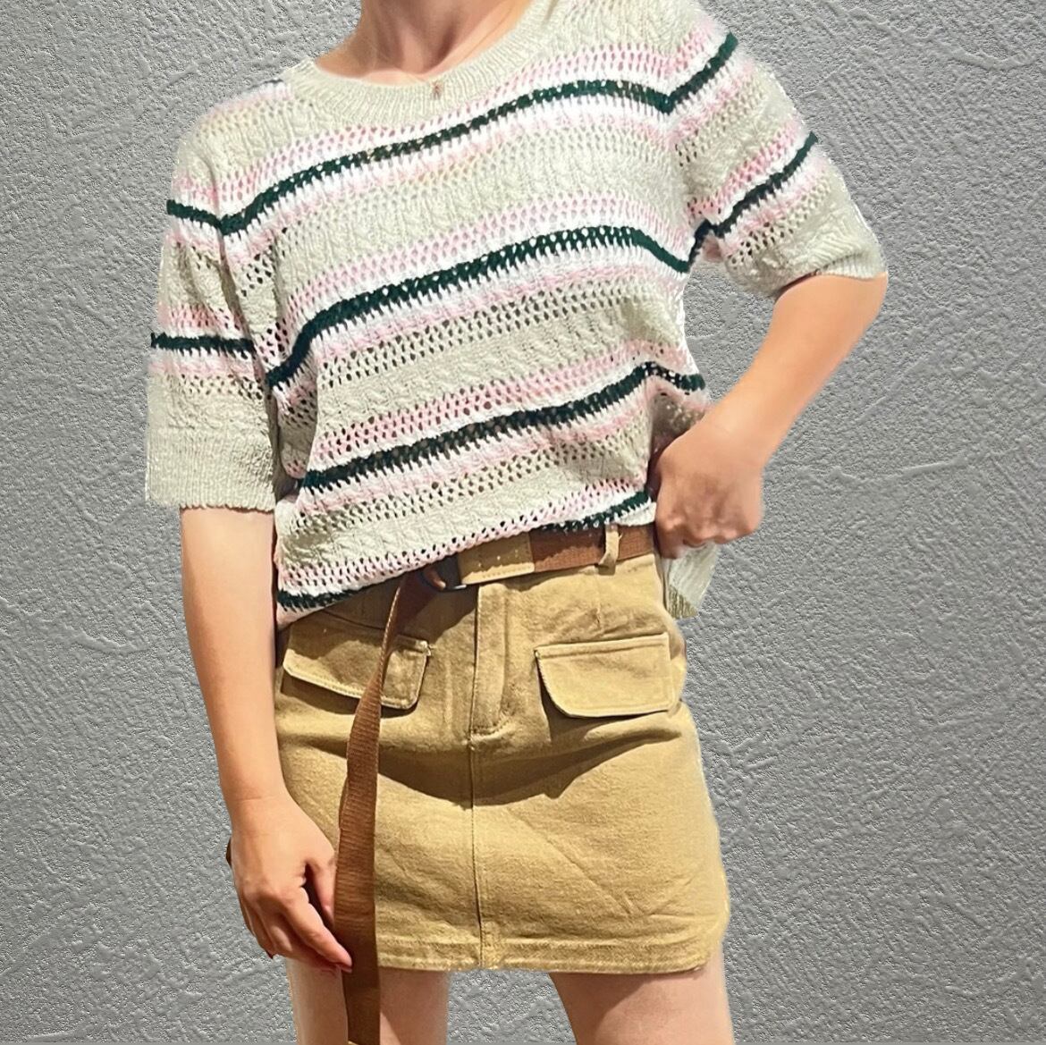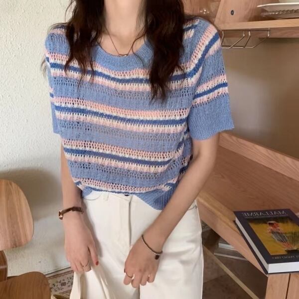 レディース/トップス/半袖/サマーニット/透かし編みニット/ボーダー柄/Uネック/韓国ファッション