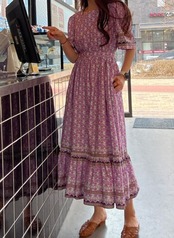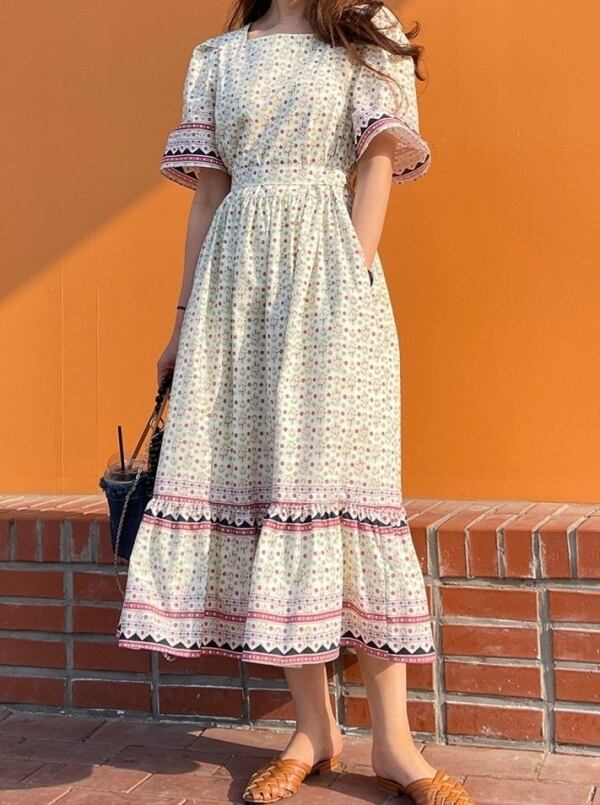 レディース/ワンピース/ロングワンピ/半袖ワンピ/レトロワンピ/メルヘン/エスニック/スクエアネック/韓国