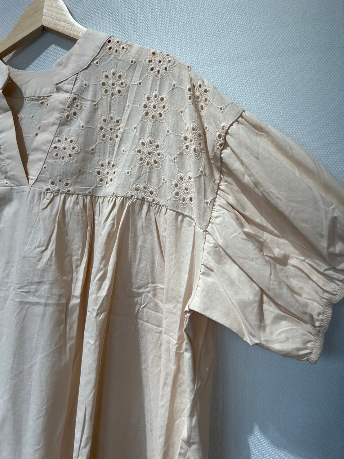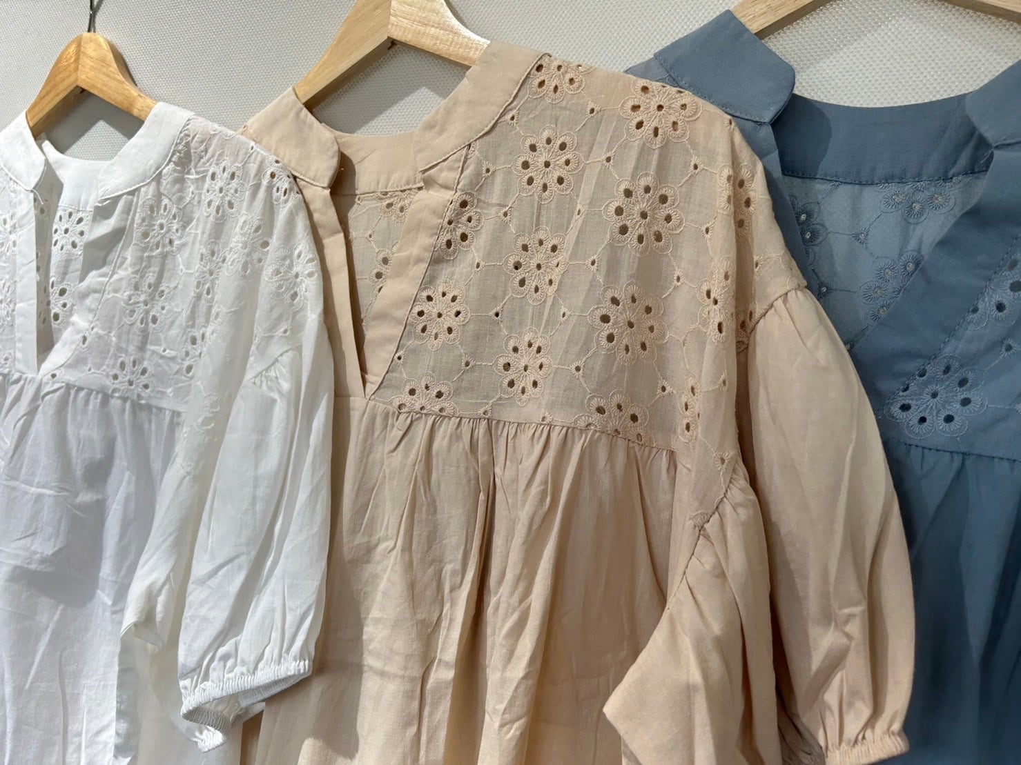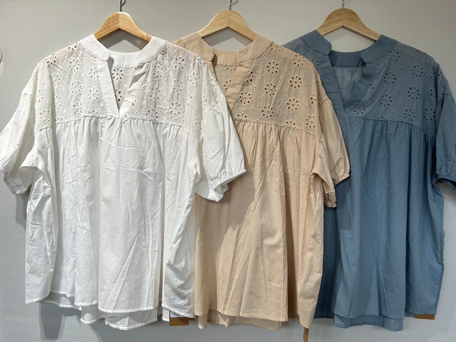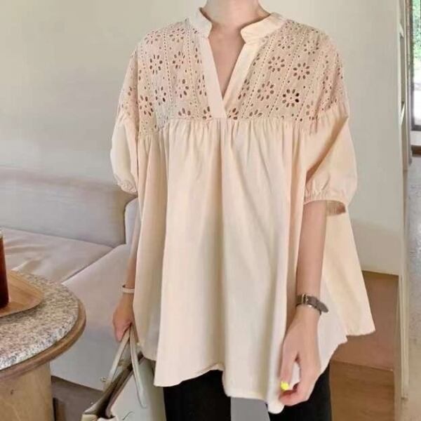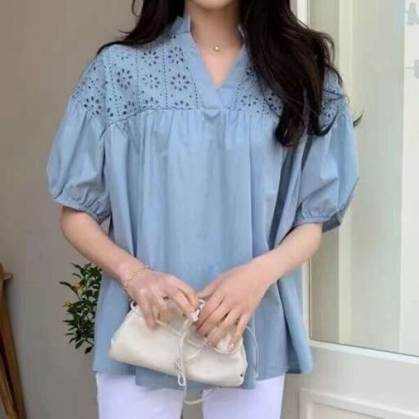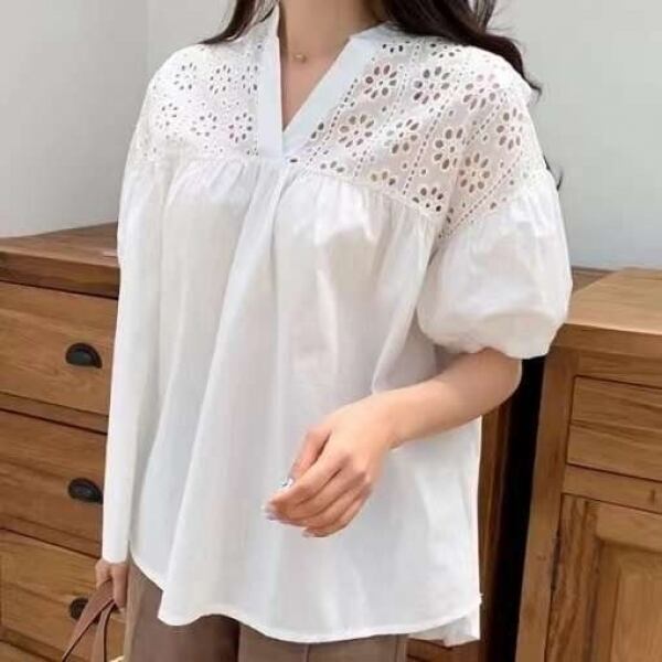 レディース/トップス/シャツ/ブラウス/Vネック/半袖/刺繍ブラウス/花刺繍/エレガント/無地/きれいめ/シンプル/韓国